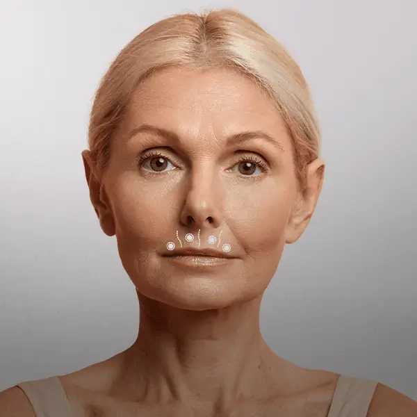 Aplicación precisa de hilos tensores para tratar arrugas verticales sobre el labio superior.